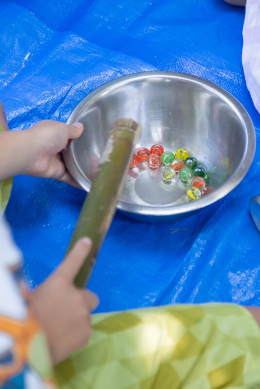 子どもたちと一緒に、音を鳴らし、笑い合う。